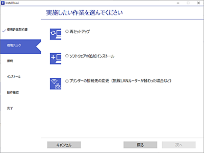 実施したい作業を選んでください画面で[プリンターの接続先の変更(無線ルーターが替わった場合など)]を選択して、[次へ]をクリックします。