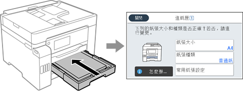 如果您在插入進紙匣時顯示的畫面上登錄紙張大小,印表機會在登錄的資訊與列印設定不同時告知您。這可確保您不會由於使用不符合紙張類型的設定列印於錯誤紙張大小上或列印錯誤色彩,從而防止紙張和墨水浪費。