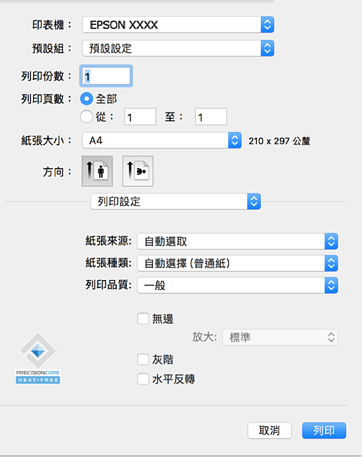 若在 macOS Catalina (10.15) 或更新版本、macOS High Sierra (10.13)、macOS Sierra (10.12)、OS X El Capitan (10.11)、OS X Yosemite (10.10)、OS X Mavericks (10.9)、OS X Mountain Lion (10.8) 中沒有顯示 [列印設定] 功能表,則表示 Epson 印表機驅動程式沒有正確安裝。從下列功能表中啟用它。