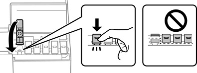 Si l’encre ne se déverse pas dans le réservoir, retirez le flacon d’encre et réinsérez-le. En revanche, ne retirez pas et ne réinsérez pas le flacon d’encre si l’encre a atteint le trait supérieur, car de l’encre pourrait s’échapper ou l'imprimante pourrait être endommagée si le niveau d'encre dépasse la ligne supérieure.