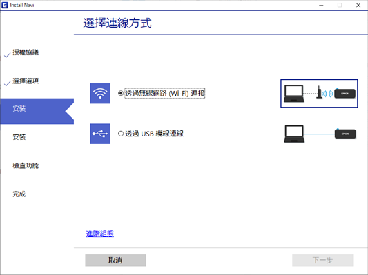 選取您要使用的網路連線,[透過無線網路 (Wi-Fi) 連接] 或 [透過有線區域網路 (乙太網路) 連線],然後點選 [下一步]。