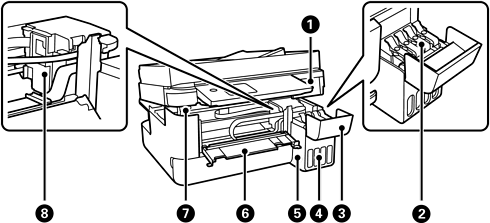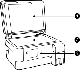 Scans placed originals. Open to remove jammed paper. This unit should usually be kept closed. |