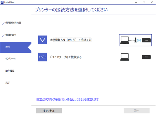 [無線LAN(Wi-Fi)]または[有線LAN(Ethernet)で接続する]から使用する接続方法を選択して、[次へ]をクリックします。