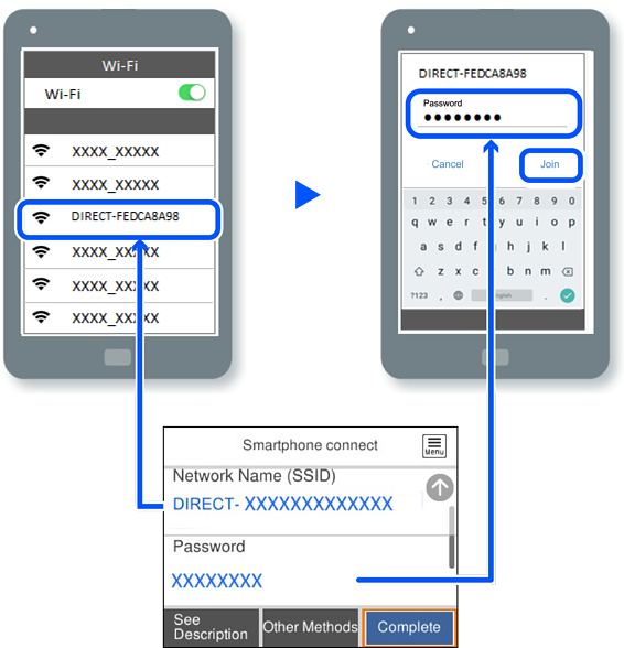 For devices that have been connected to the printer before, select the network name (SSID) on the device's Wi-Fi screen to connect them again.