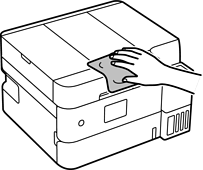 Ja komponenti un korpuss ir netīrs vai noputējis, izslēdziet printeri un notīriet tos, izmantojot mīkstu, tīru, ūdenī samitrinātu drānu. Ja neizdodas notīrīt netīrumus, mēģiniet mitrajai drānai pievienot mazliet saudzīga mazgāšanas līdzekļa.