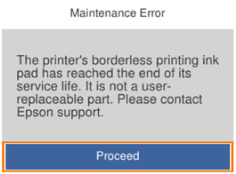 Kad tiek parādīts tālāk redzamais ekrāns, lietotāji nevar veikt daļas nomaiņu. Sazinieties ar Epson atbalsta dienestu.