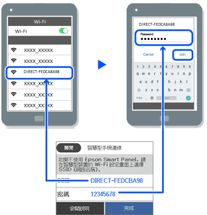 在裝置的 Wi-Fi 畫面上,選取印表機控制面板上顯示的 SSID,然後輸入密碼。