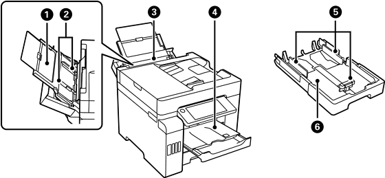 Hoiab väljastatud paberit. Kui hakkate printima, lükatakse see salv paberi suurusega sobitamiseks automaatselt välja. Salve hoiustamiseks vajutage see käsitsi sisse või valige juhtpaneelilt |