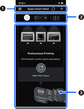 ابدأ Epson Smart Panel من جهازك الذكي وحدد العنصر الذي تريد استخدامه من الشاشة الرئيسية.