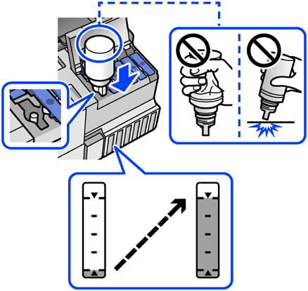 अगर टैंक में इंक का बहाव शुरू न हो, तो इंक की बोतल निकालकर इसे फिर से लगाएं। हालाँकि, इंक के ऊपरी रेखा तक पहुँचने पर इंक बोतल फिर से न लगाएँ; नहीं तो इंक लीक हो सकती है।