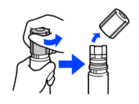 5. Tenendo la bottiglia di inchiostro in posizione verticale, ruotare lentamente il cappuccio per rimuoverlo.