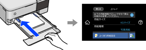 用紙トレイ挿入時にプリンターに表示される画面で、用紙サイズと種類を登録しておくと、登録情報と印刷設定が異なるときにプリンターがお知らせします。サイズを間違って印刷してしまったり、用紙種類に合った印刷ができず色味が変わってしまったりすることを防ぎ、用紙やインクを無駄にせずに済みます。