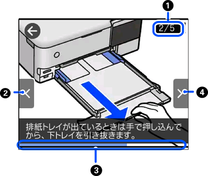 動画を構成する手順の総数と、現在表示している手順が何番目かを示します。 この画面の例では、全5手順中の2番目の手順を表示していることを示します。 |