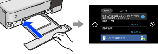 用紙トレイ挿入時にプリンターに表示される画面で、用紙サイズと種類を登録しておくと、登録情報と印刷設定が異なるときにプリンターがお知らせします。サイズを間違って印刷してしまったり、用紙種類に合った印刷ができず色味が変わってしまったりすることを防ぎ、用紙やインクを無駄にせずに済みます。