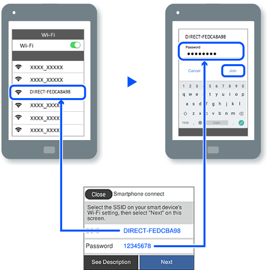 Sur l’écran Wi-Fi du périphérique intelligent, sélectionnez le SSID affiché sur le panneau de commande de l’imprimante pour vous connecter, puis saisissez le mot de passe.