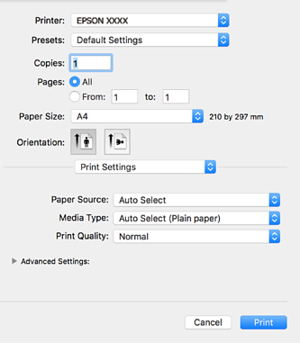 Если меню Настройки печати не отображается в операционных системах macOS Catalina (10.15) и выше, macOS High Sierra (10.13), macOS Sierra (10.12), OS X El Capitan (10.11), OS X Yosemite (10.10), OS X Mavericks (10.9), OS X Mountain Lion (10.8), это значит, что драйвер принтера Epson установлен неправильно. Включите его в следующем меню.