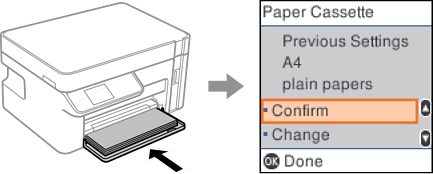 Jika ukuran dan jenis kertas yang ditampilkan berbeda dengan kertas yang dimasukkan, pilih Ubah untuk mengubahnya. Pilih ukuran dan jenis kertas, periksa pengaturan, lalu tekan tombol OK. Jika pengaturan sesuai dengan kertas yang dimasukkan, pilih Konfirmasikan.