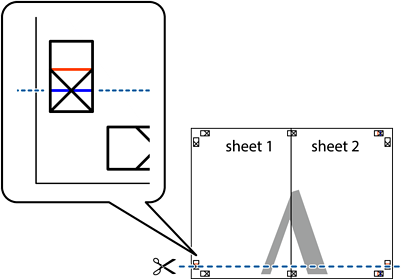 Sheet 1とSheet 2を、×印に交わった横線(青色)を結ぶ線で切ります。