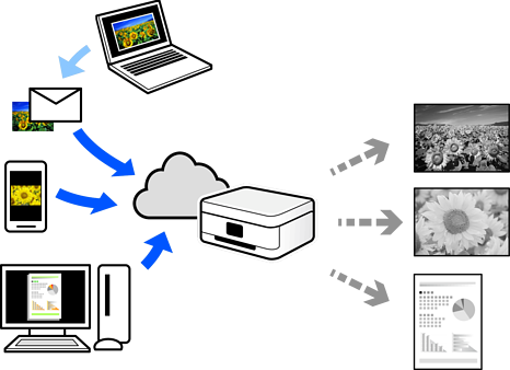 インターネットを利用したEpson Connect(エプソン コネクト)サービスを使うと、コンピューターやスマートデバイスからいつでもどこからでも印刷できます。このサービスの利用には、Epson Connectのセットアップ(ユーザー登録、プリンター登録)が必要です。