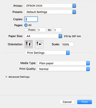Если меню Настройки печати не отображается в операционных системах macOS High Sierra, macOS Sierra, OS X El Capitan, OS X Yosemite, OS X Mavericks, OS X Mountain Lion, это значит, что драйвер принтера Epson установлен неправильно. Включите его в следующем меню. В macOS Mojave нельзя получить доступ к разделу Настройки печати в приложениях, созданных Apple, например в TextEdit.