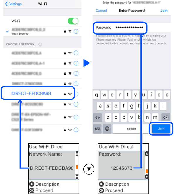 Na obrazovke Wi-Fi na inteligentnom zariadení vyberte SSID zobrazené na ovládacom paneli tlačiarne a potom zadajte heslo.