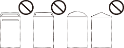 のり付けおよび接着の処理が施された封筒や二重封筒、窓付き封筒、フラップ(封を閉じる折り返しの部分)が円弧や三角形状の長形封筒や角形封筒は使用しないでください。紙詰まりや印刷汚れの原因になります。