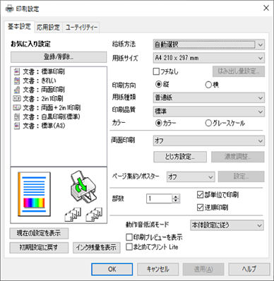 各項目の詳細は、プリンタードライバーのメニュー説明をご覧ください。