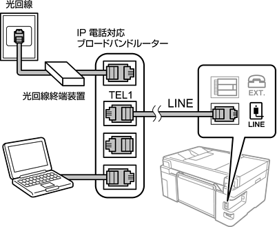 IP電話対応のブロードバンドルーターとプリンター背面部のLINEポートをモジュラーケーブルで接続します。詳しくはご契約の回線事業者に問い合わせてください 。