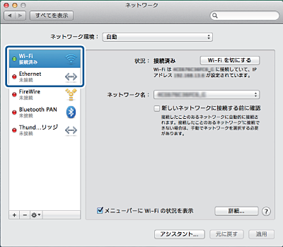 メニューの[システム環境設定] - [ネットワーク]の順に選択して、ネットワーク画面で接続の状態を確認してください。