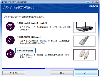 プリンター接続先の選択の画面で[USBローカル接続]を選択します。