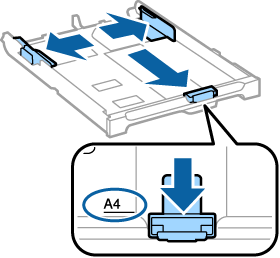 2 左右の用紙ガイドを広げます。手前の用紙ガイドをA4サイズに合わせます。