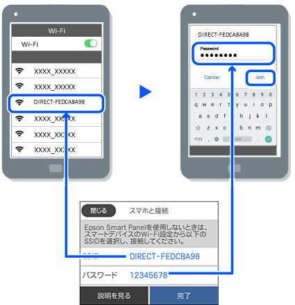 デバイスのWi-Fi接続画面を表示し、プリンターの操作パネルに表示されたSSIDを選択して、パスワードを入力します。