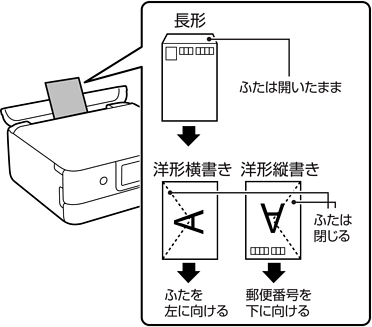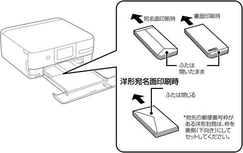 用紙トレイにセットするときは、印刷する面を下にして、図の矢印の向きで用紙トレイの奥に突き当ててセットします。その後用紙ガイドを封筒の側面に合わせてください。