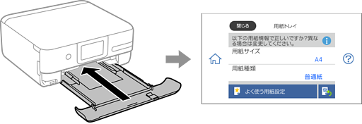 用紙トレイ挿入時にプリンターに表示される画面で、必ず用紙サイズと種類を登録してください。登録情報と印刷設定が異なるときにプリンターがお知らせします。サイズを間違って印刷してしまったり、用紙種類に合った印刷ができず色味が変わってしまったりすることを防ぎ、用紙やインクを無駄にせずに済みます。