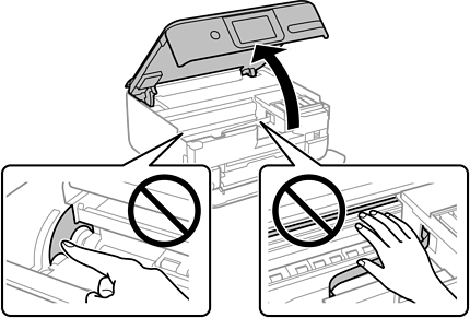 電源を切ってもインクタンクがホームポジションに戻らない場合は、インクタンクを手で押して移動してください。インクが漏れるおそれがあります。