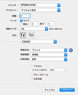 OS X Mountain Lion以降で[印刷設定]メニューが表示されないときは、エプソンのプリンタードライバーが設定できていません。