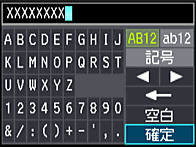 ネットワーク設定時の数字や文字、記号の入力は、 ボタンと画面に表示されるキーボードを使います。 ボタンで入力したい文字を選択して、OKボタンで決定します。入力が全て終わったら[確定]を選択して、OKボタンで決定します。