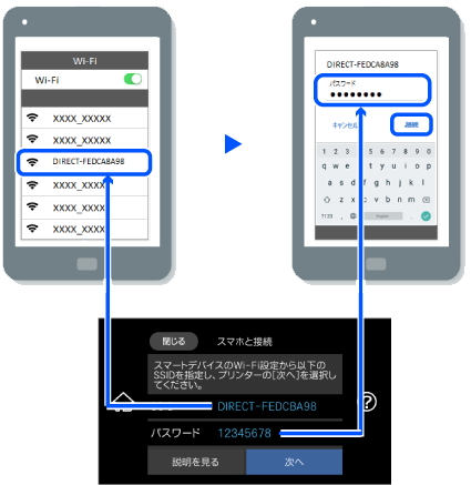 デバイスのWi-Fi接続画面を表示し、プリンターの操作パネルに表示されたSSIDを選択して、パスワードを入力します。