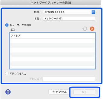 5[ネットワークスキャナーの追加]画面が表示されたら、以下の項目を入力して[追加]をクリックします。
