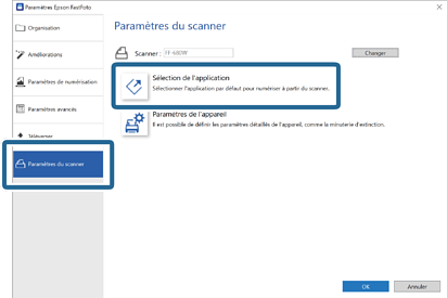 Cliquez sur Sélection de l'application sous l’onglet Paramètres du scanner.