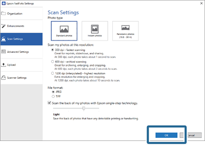 3Engedélyezze az A fotók hátoldalának szkennelése az Epson egylépéses technológiájával funkciót, majd állítsa be az érzékelés szintjét a csúszka segítségével.