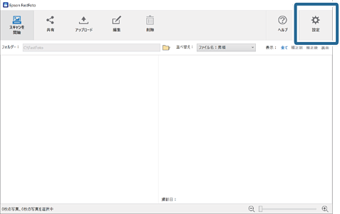 インスタント写真をスキャンするには、事前に設定を変更します。メイン画面で[設定]をクリックします。