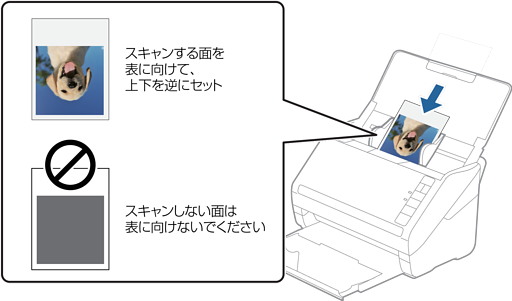 インスタント写真をセットするときは、スキャンする面を表に向けて、上下を逆にして給紙トレイにセットします。