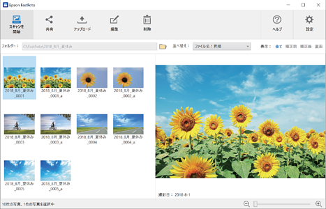 スキャンの後、Epson FastFotoで画像を共有、アップロード、編集できます。サムネイルの表示設定を変更することもできます。