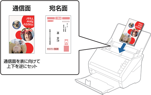 ハガキの通信面を表に向けて、上下を逆にしてスキャナーにセットします。