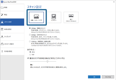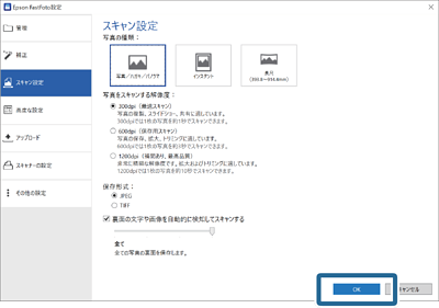 ハガキの宛名面もスキャンするときは、[裏面の文字や画像を自動的に検知してスキャンする]を有効にします。