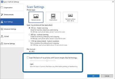Aktiver Skann baksiden av bildene mine med Epson single-step-teknologi, og juster så nivået med glidebryteren.