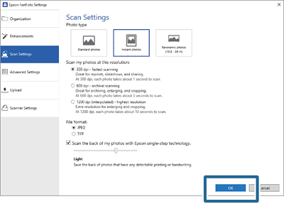 Если после текущего сканирования вы собираетесь сканировать другие типы фотографий, измените тип фотографий на вкладке Настройки сканирования.
