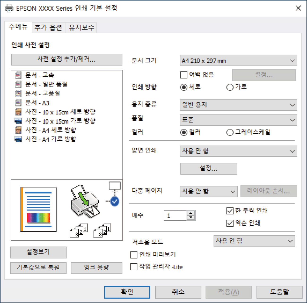 프린터 드라이버 창을 열려면 기본 설정 또는 속성을 선택합니다.