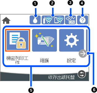 表示已為印表機設定 [靜音模式]。若啟用此功能,印表機在操作過程中所產生的噪音會降低,但列印速度也可能會減慢。不過,根據所選紙張種類和列印品質而定,噪音也可能不會降低。選取以變更設定。您還可從 [設定] 功能表進行此設定。 [設定] > [一般設定] > [印表機設定] > [靜音模式] |